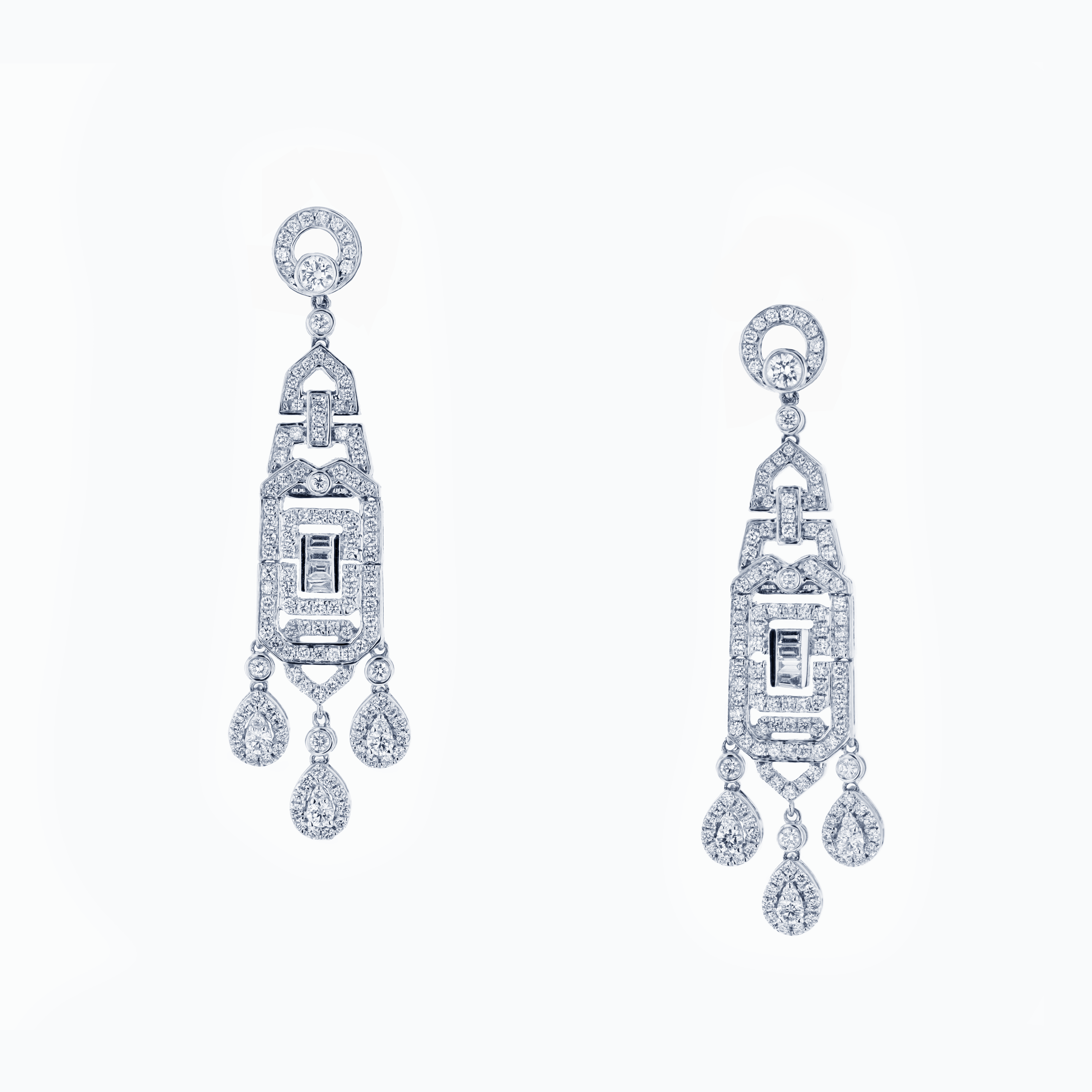 Striking Art Deco Design: A bold, architectural silhouette balanced by graceful dangling pear-shaped diamonds for movement and softness.