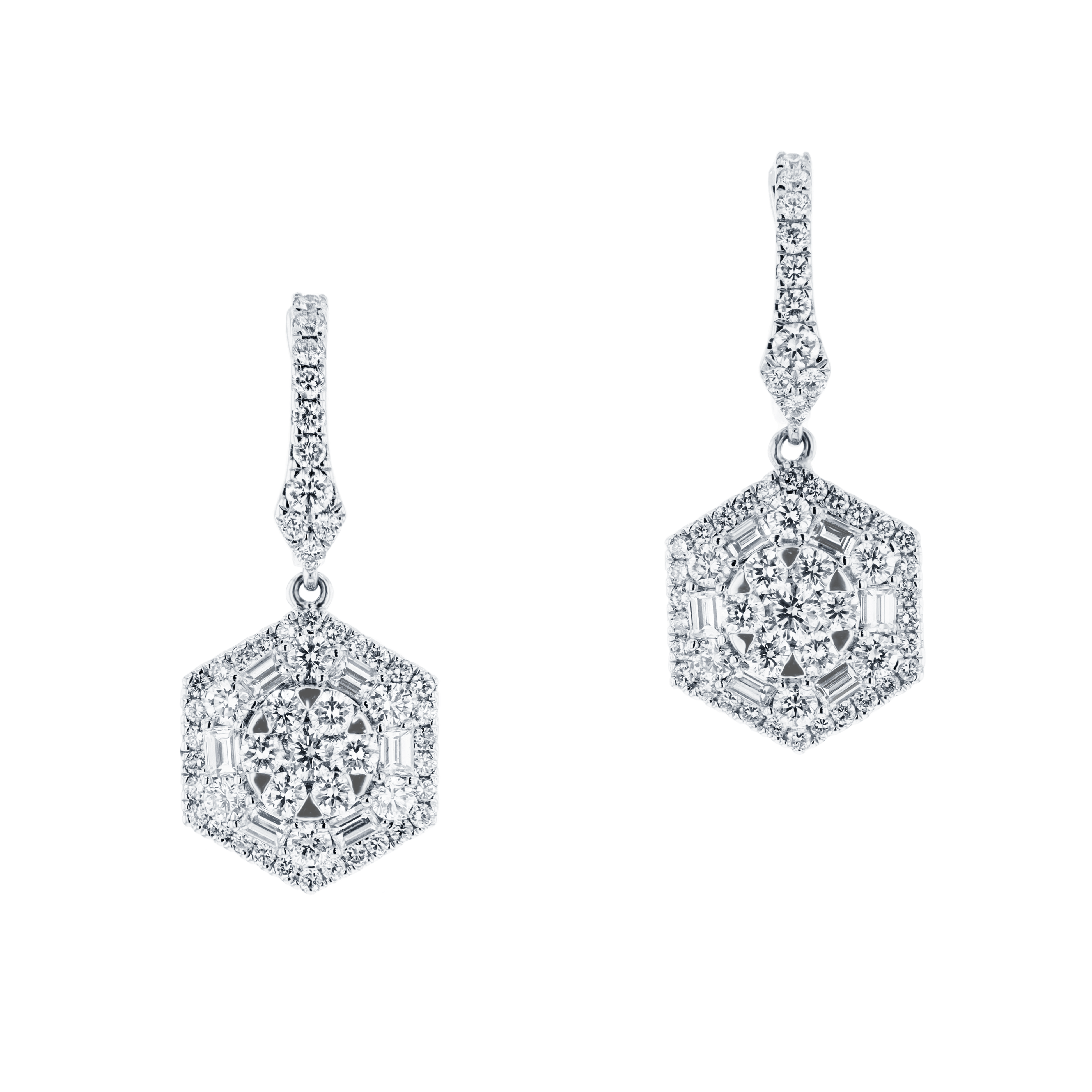 Sculptural Design: A hexagon-shaped drop creates a strong, architectural silhouette softened by layers of sparkling diamonds.
