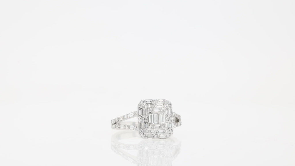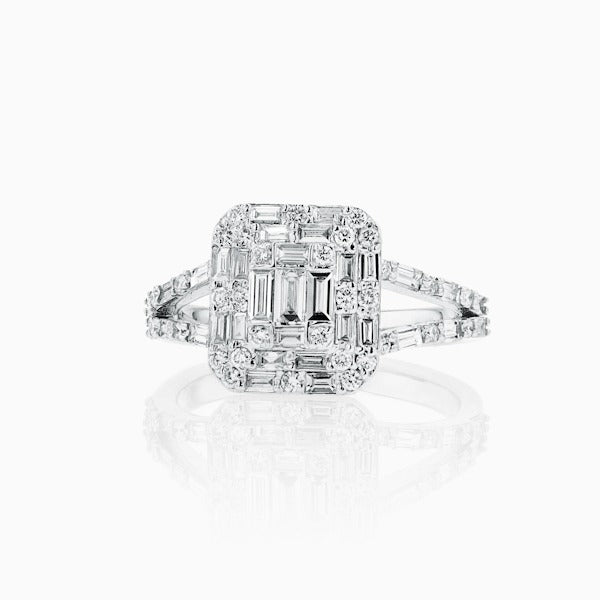 Elegant Center Design: A carefully arranged mix of baguette and round diamonds forms a structured, rectangular silhouette with beautiful depth and sparkle.