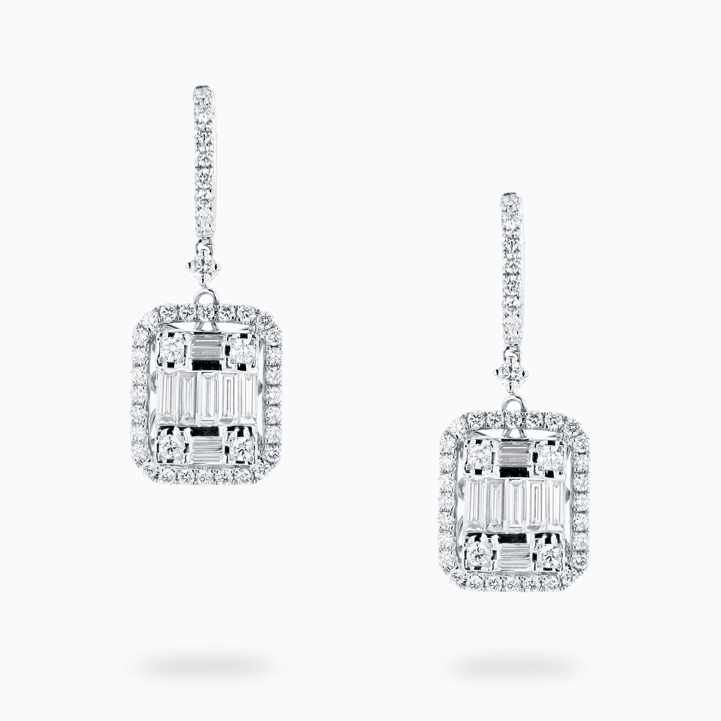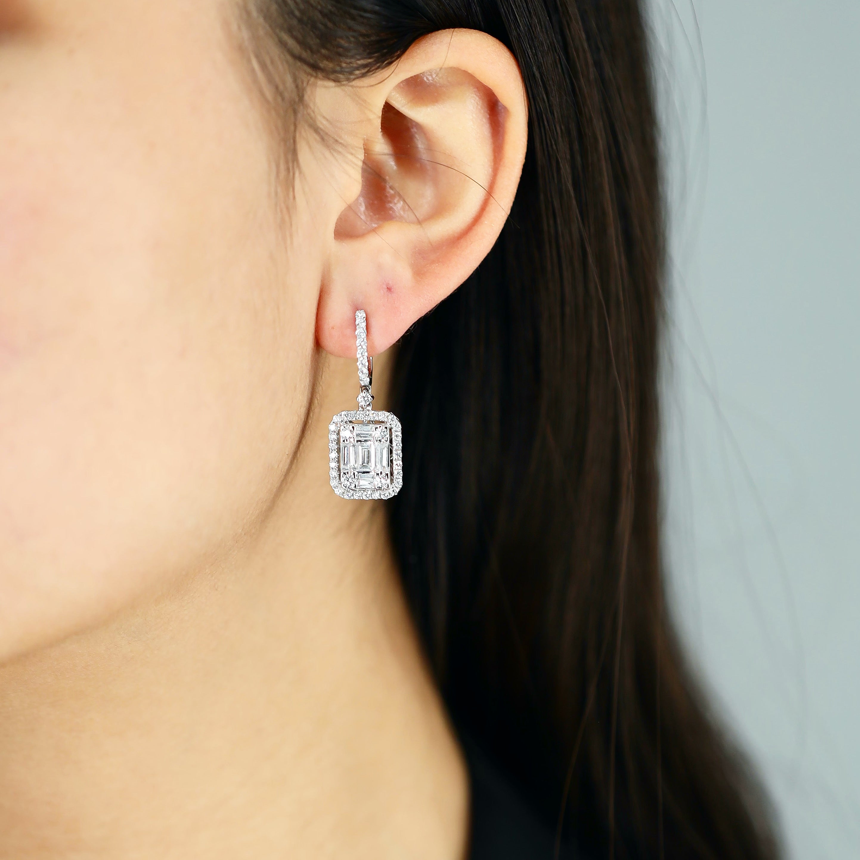 Timeless Art Deco Design: Each earring features a rectangular drop framed by a halo of round diamonds, with baguette-cut diamonds arranged in a structured, architectural pattern at the center.