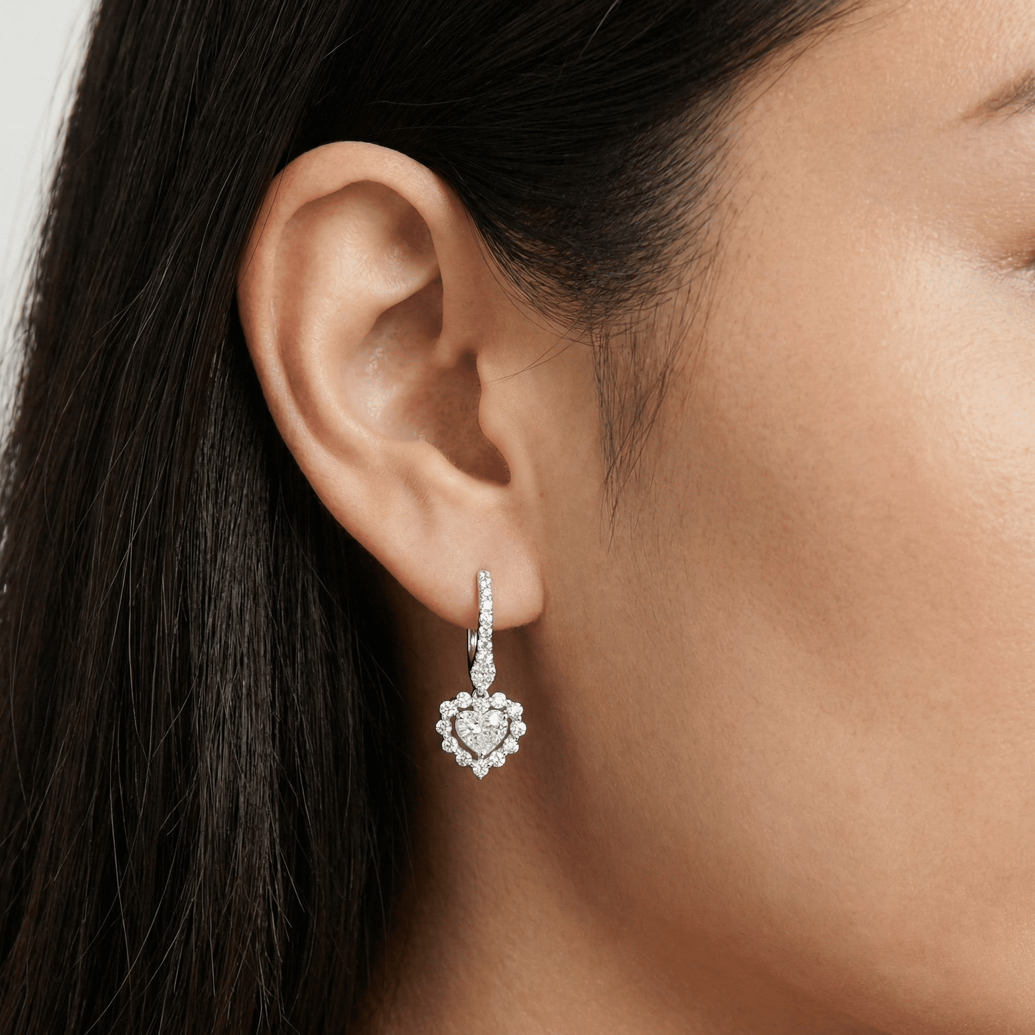 The Seamless Love Drop Earrings are a romantic statement designed to sparkle with every movement. Crafted in luminous 18K white gold, each earring features a brilliant heart-shaped diamond centerpiece framed by a shimmering halo, suspended from a delicate diamond-accented drop for an elegant, elongated silhouette. With 1.30ct total diamond weight in bright F–G color and VS-2 clarity, these earrings deliver exceptional brilliance and a timeless, love-inspired finish—perfect for special occasions, gifting, or elevated evening wear.