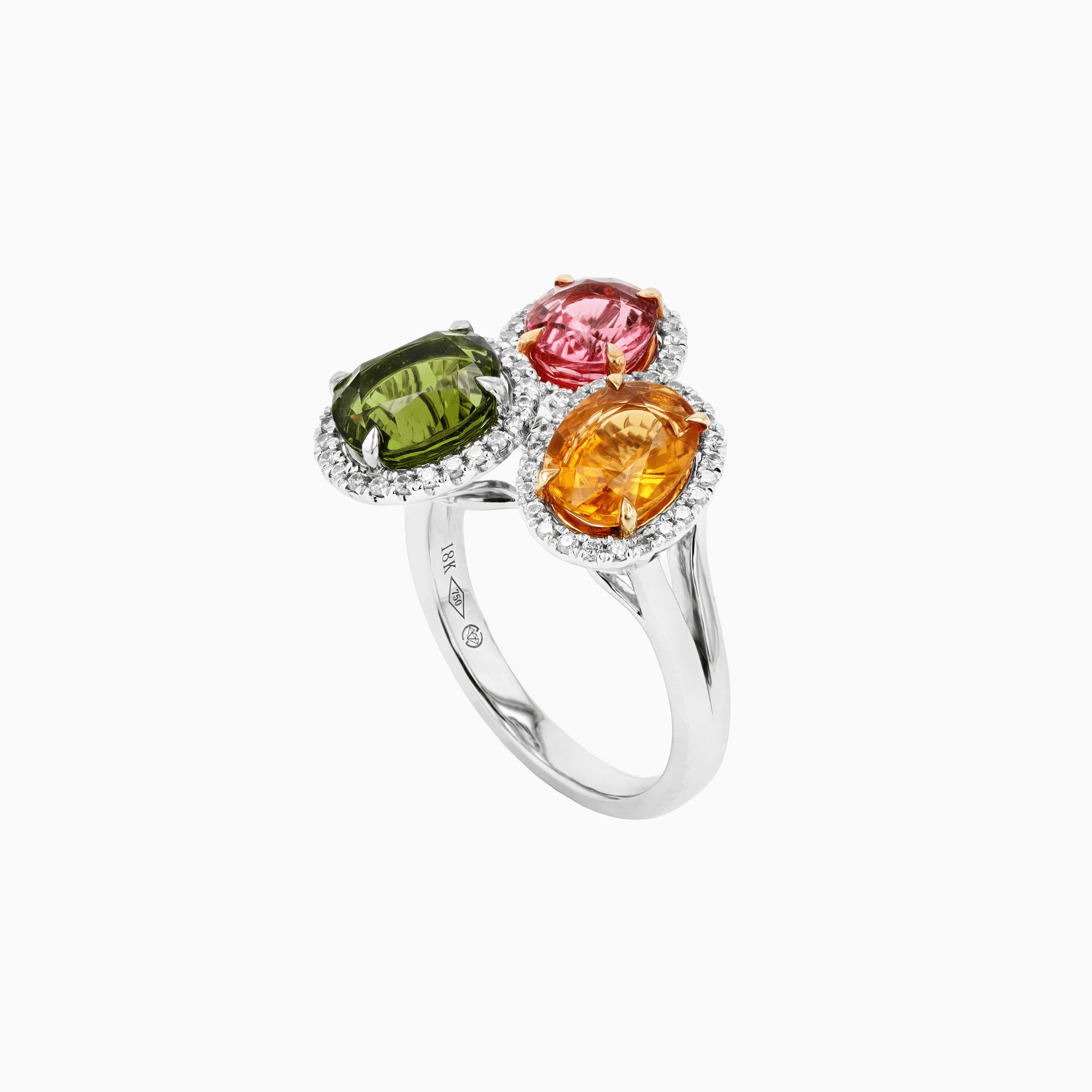 The Gemma Trio Ring is a vibrant celebration of color and brilliance, designed with three striking oval tourmalines framed by delicate diamond halos. Crafted in luminous 18K white gold and finished with rhodium for enhanced brightness, the design showcases a captivating trio of richly saturated gemstones totaling 4.83 carats. Each tourmaline is encircled by round brilliant diamonds totaling 0.34 carats, graded VS-2 clarity and G–H color, offering crisp sparkle and refined fire. Bold yet elegantly balanced, this statement ring spans approximately 3/4 inch in width, creating a luxurious presence while maintaining graceful proportion.