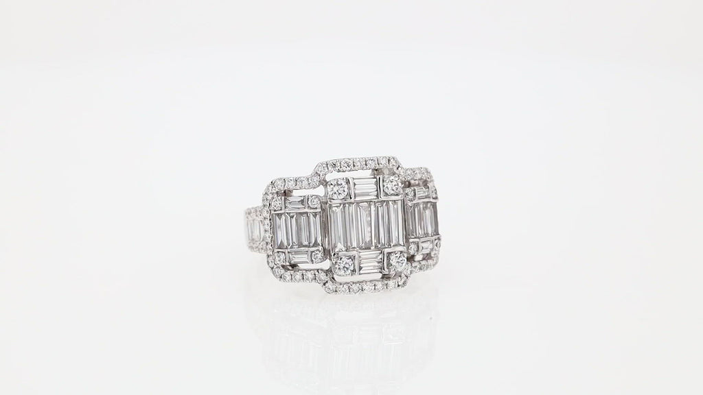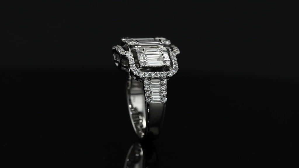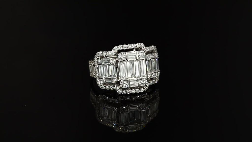 This Deco Magnitude ring is a bold expression of architectural elegance and timeless luxury. Designed with clean lines and a striking mix of baguette and round diamonds, it delivers powerful sparkle with a refined, modern edge.