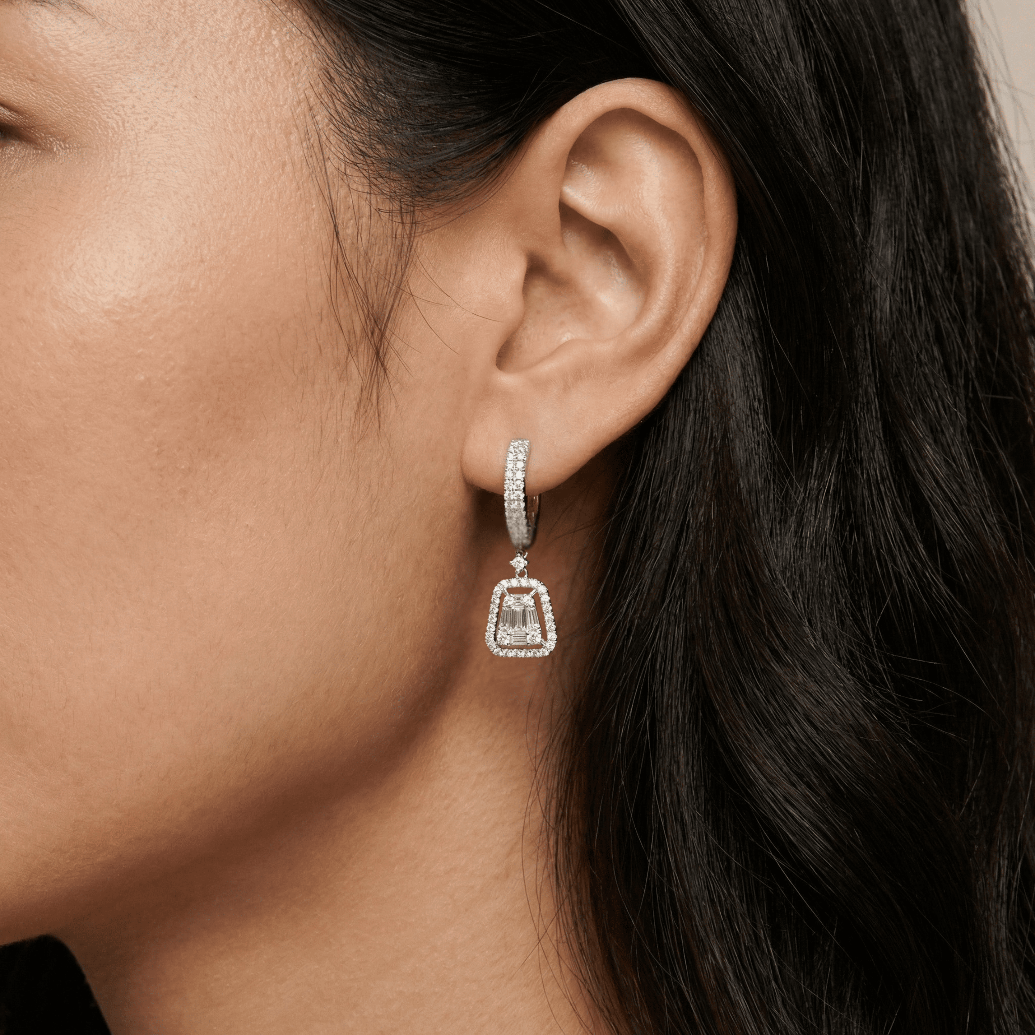 The Deco Vicenza Drop Earrings offer an elegant play of movement and sparkle, blending clean Art Deco lines with a softer, feminine drop silhouette. Baguette and tapered diamonds form a structured center, framed by a delicate halo of round diamonds that catch the light with every turn. Finished with diamond-set huggie tops, these earrings feel refined yet effortlessly eye-catching—perfect for dressing up without feeling too formal.
