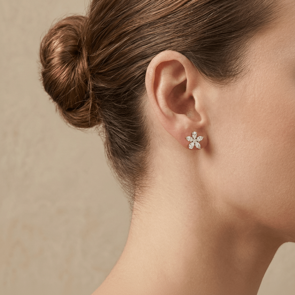 The Flora Studs are a delicate yet radiant expression of timeless femininity, inspired by the natural beauty of blooming petals. Crafted in luminous 18k rose gold, these elegant stud earrings feature a floral silhouette formed by carefully arranged marquise-cut diamonds, creating a soft, refined sparkle. With a total diamond weight of 0.80 carats and VS-2 clarity in a G–H color range, the diamonds offer exceptional brilliance and fire while maintaining a graceful, understated presence. Designed to sit perfectly on the ear, the Flora Studs are ideal for everyday elegance or as a subtle accent for special occasions. Lightweight and beautifully balanced at 2.79 grams, they deliver comfort without compromising on luxury, making them a timeless addition to any fine jewelry collection.