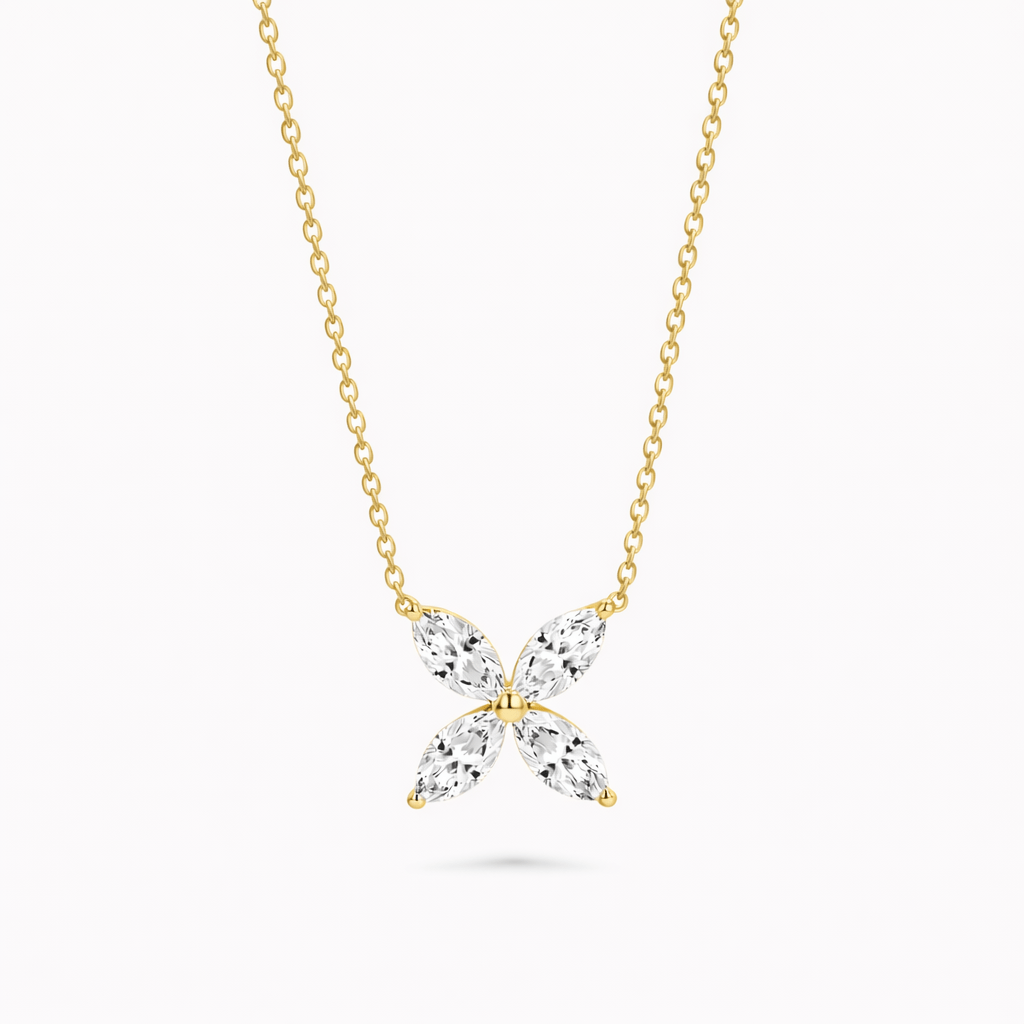 Discover modern elegance with The Marquise Diamond Cluster Necklace. Featuring four lab-grown marquise-cut diamonds artfully arranged in a floral-inspired design, this necklace exudes sophistication and charm. Each lab diamond is set in a secure yet delicate prong setting, showcasing their brilliance and unique shape.